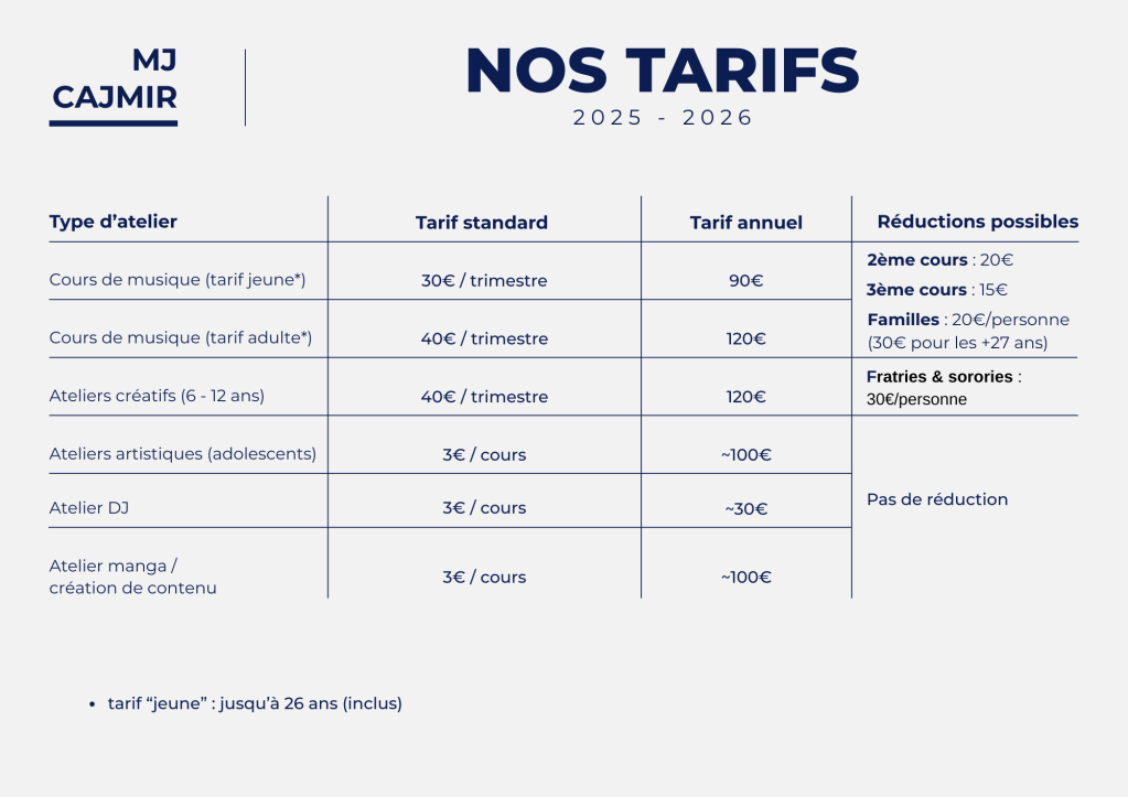 Cours d’instruments de musique : 20€ par trimestre et par enfant (30€ pour les plus de 27 ans)